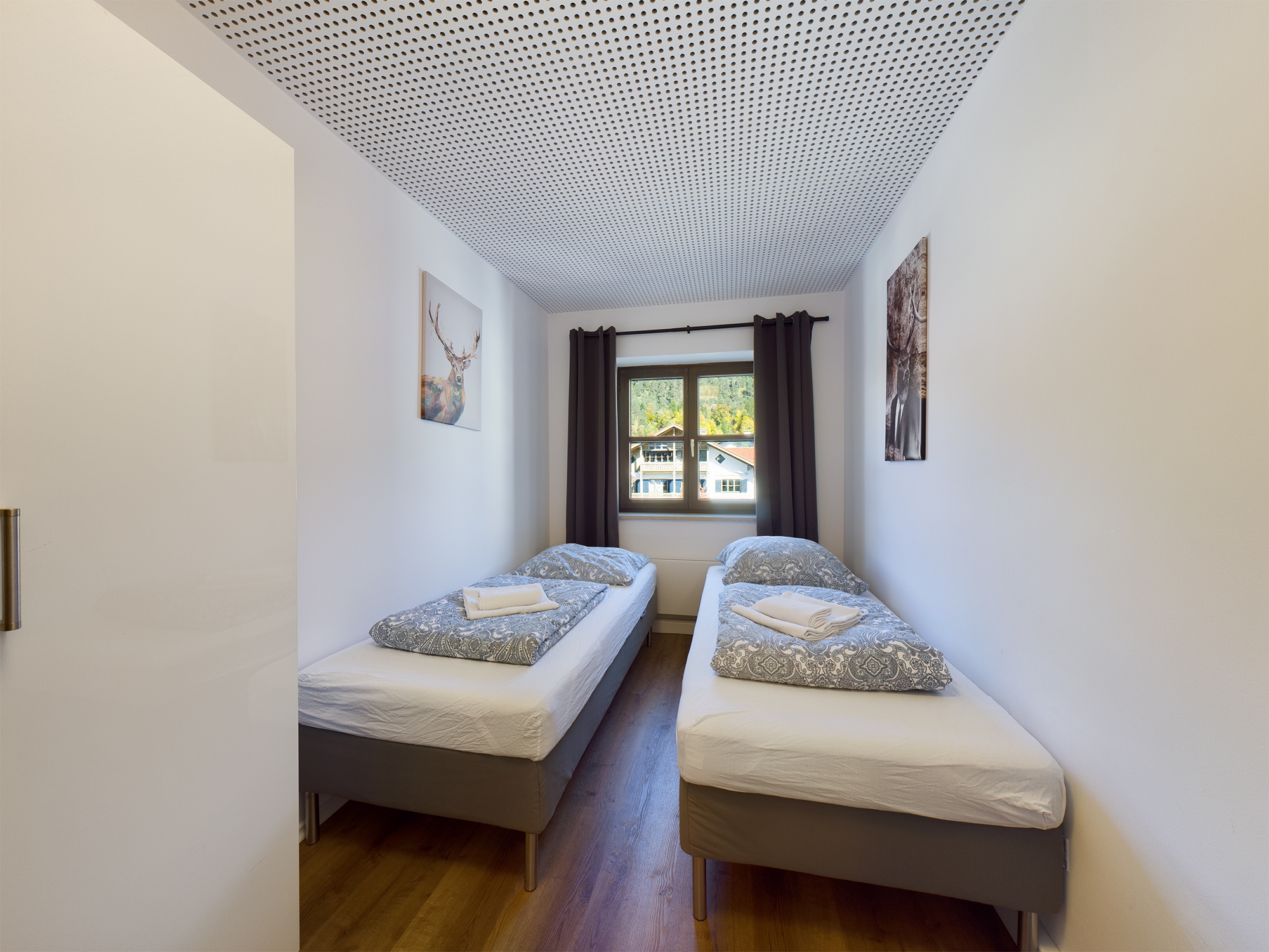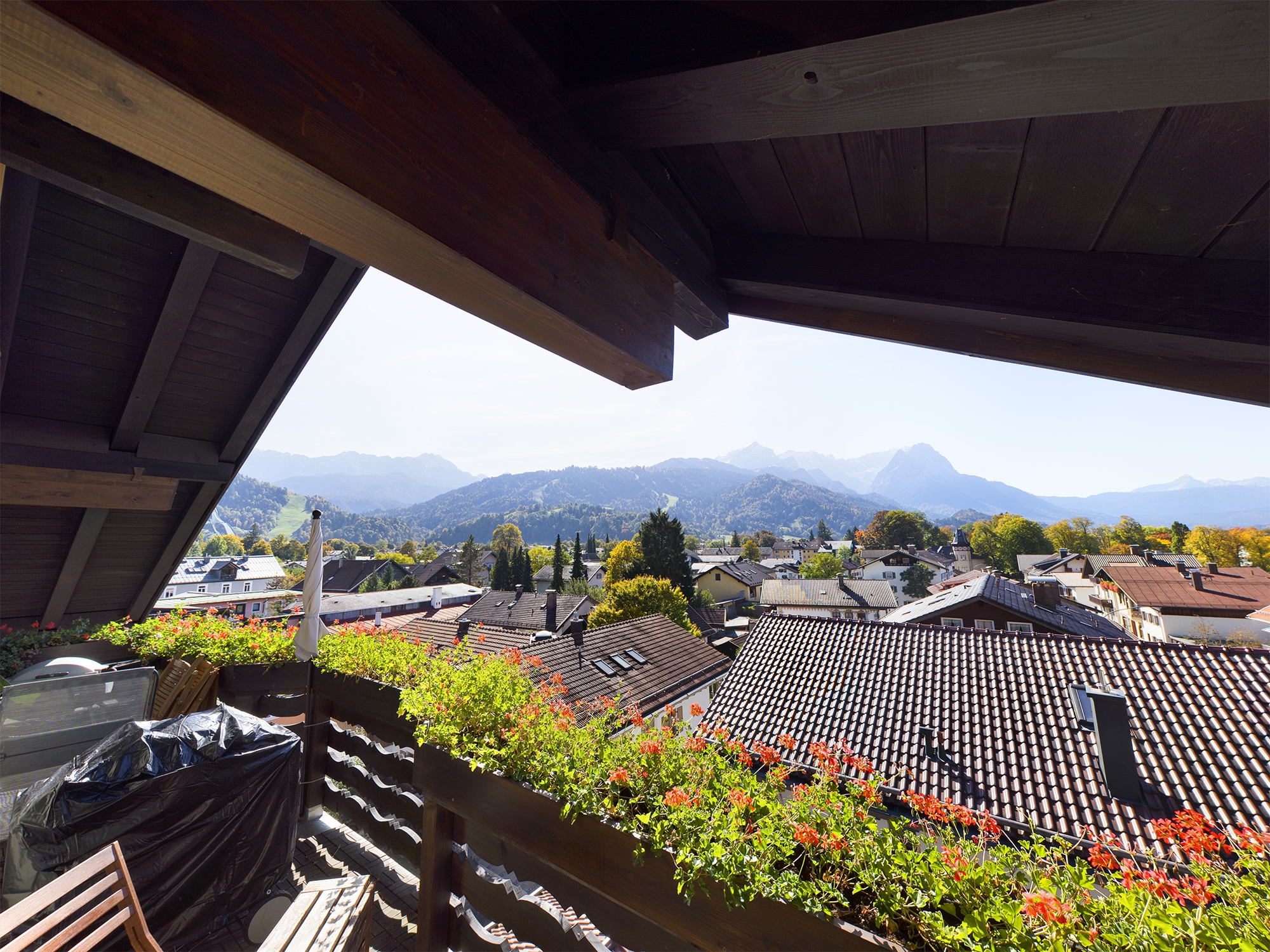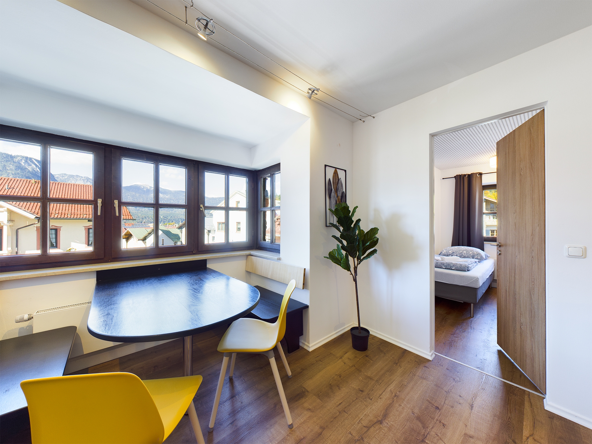 Vom Wohnzimmer aus haben sie freie Sicht auf die Zugspitze. Im Flur befindet sich die voll ausgestattete Küche. Somit eine ideale Wohnung für die kleine Familie, aber auch für 4 Erwachsene.