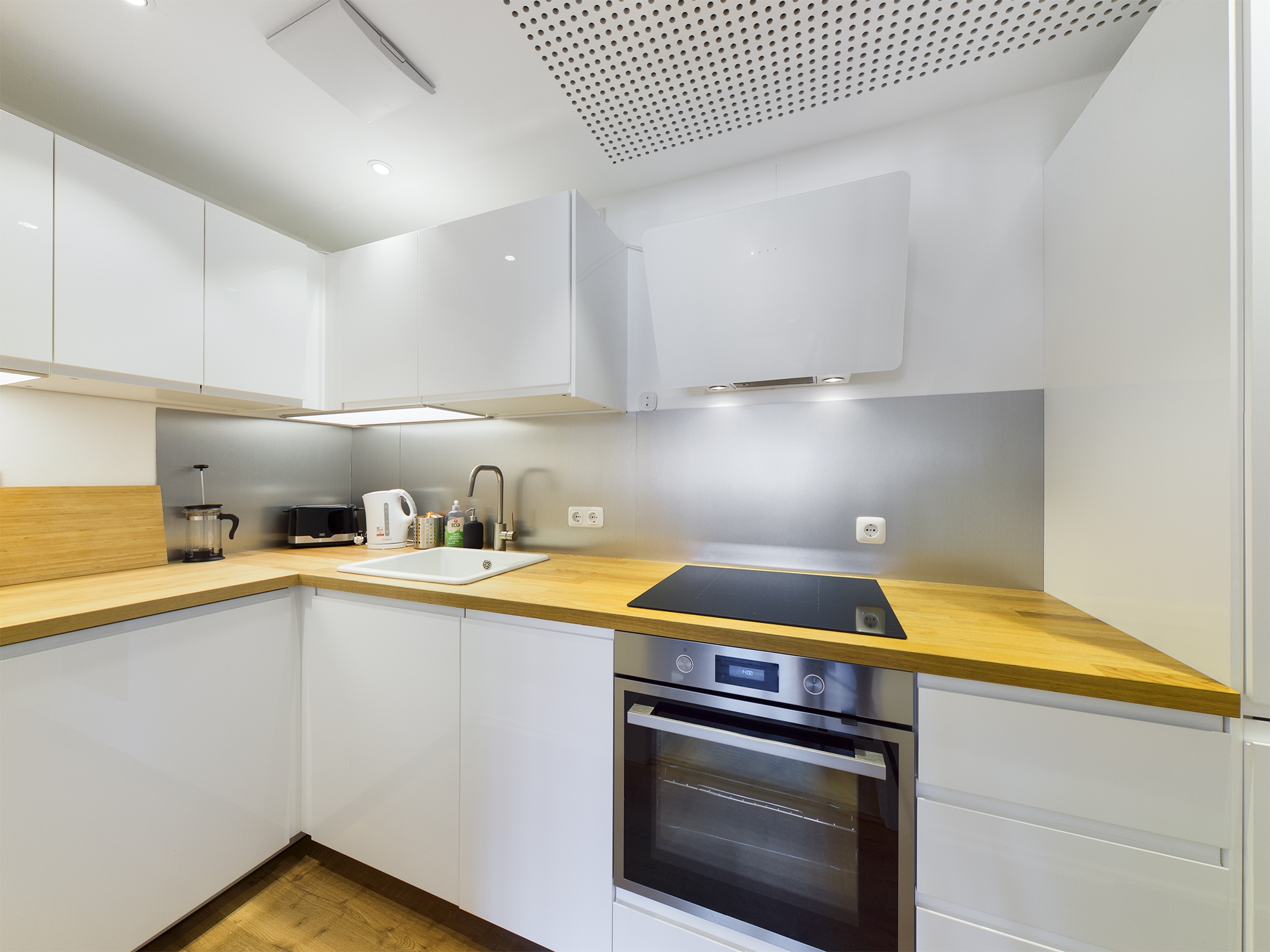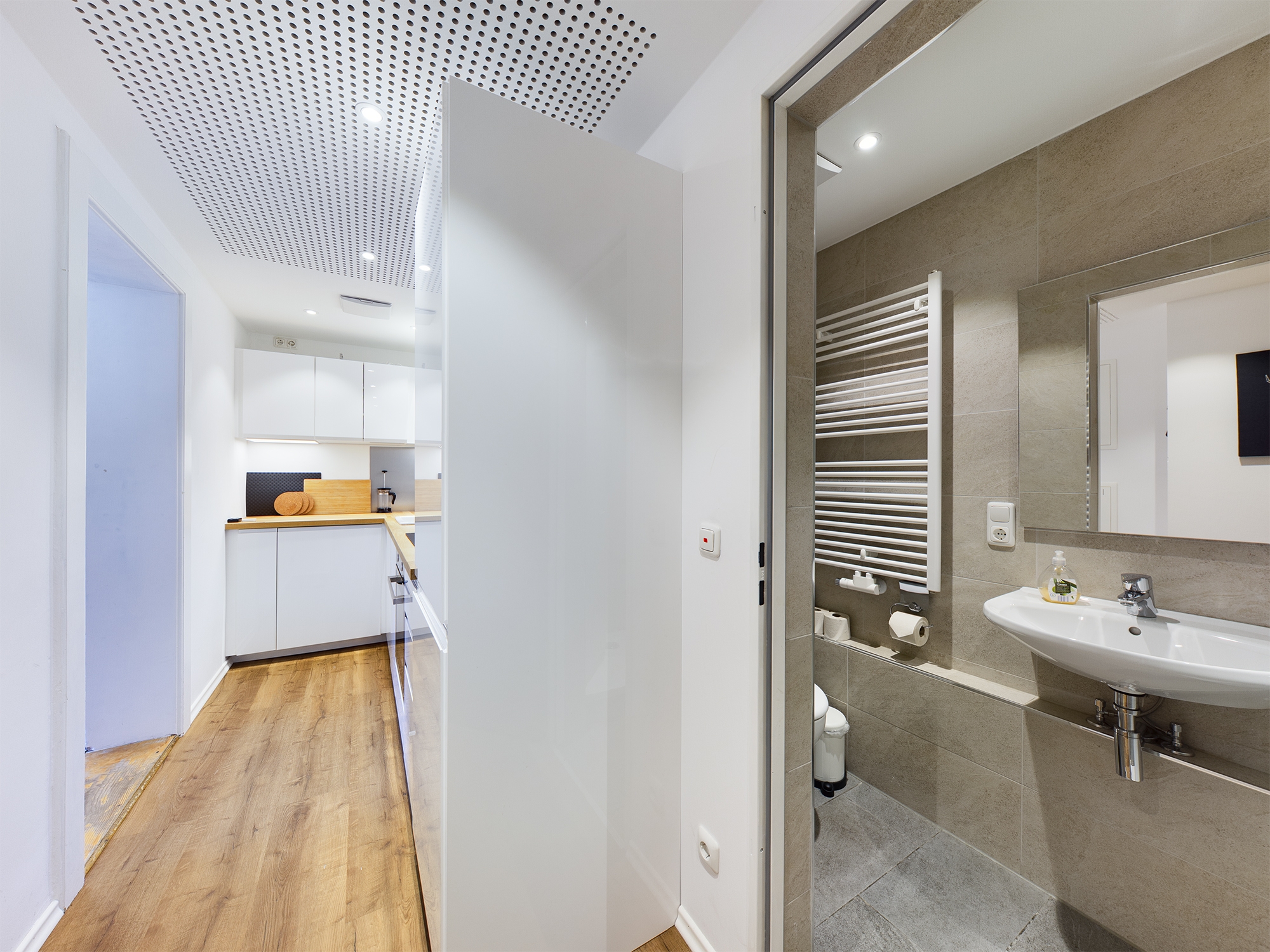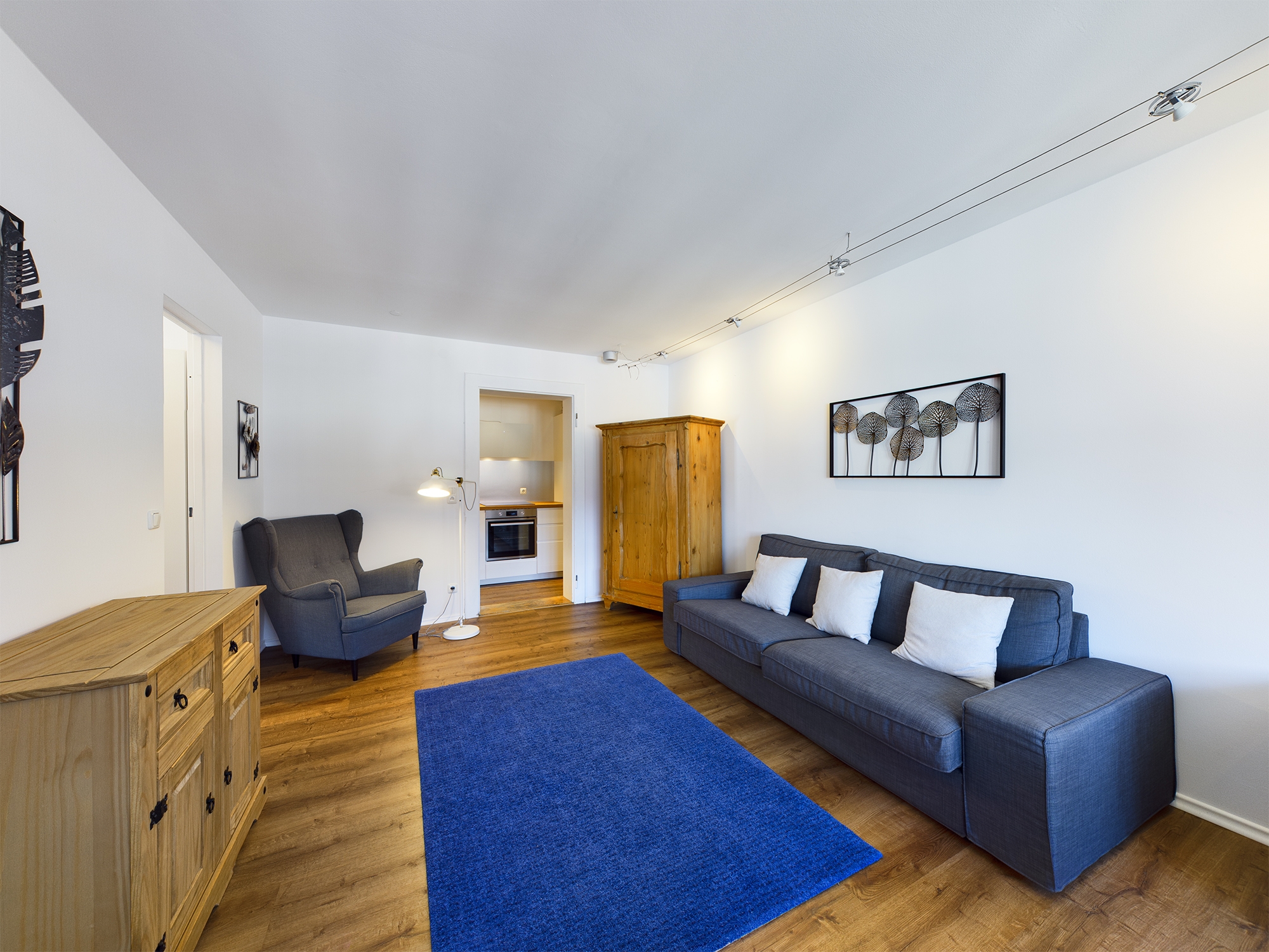 Vom Wohnzimmer aus haben sie freie Sicht auf die Zugspitze. Im Flur befindet sich die voll ausgestattete Küche. Somit eine ideale Wohnung für die kleine Familie, aber auch für 4 Erwachsene.